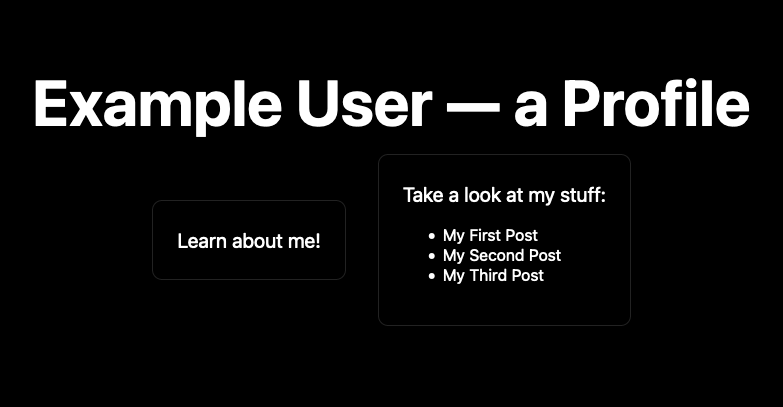 1 2 3 4 5 6 7 8 9 10 11 12 13 14 15 16 17 18 19 20 21 22 23 24 25 26 27 28 29 30 31 32 33 34// Import the JSX and style modules to be used for the page. The CSS file // here is the default one for a base Next project. import Head from 'next/head' import styles from '../styles/Home.module.css' // Create the function for the home page. export default function Home() { // Render the page template. return ( <div className={styles.container}> <Head> <title>My Next.js Profile Page</title> <meta name='description' content='Generated by create next app' /> <link rel='icon' href='/favicon.ico' /> </Head> <main className={styles.main}> <h1 className={styles.title}> Example User — a Profile </h1> <div className={styles.grid}> <div className={styles.card}> <p>Learn <a href='/about'>about me</a>!</p> </div> </div> </main> <footer className={styles.footer}> Created for a Linode guide </footer> </div> ) }